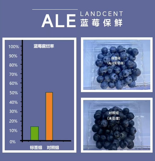 莱慎生物联合上海市农业科学院农产品保鲜加工研究中心开展的“大蒜E素在常温条件下对蓝莓采后防腐保鲜试验”显示,储藏6天后,经ALE处理的蓝莓腐烂率仅为15%,而对照组(未处理)的蓝莓腐烂率高达50%。