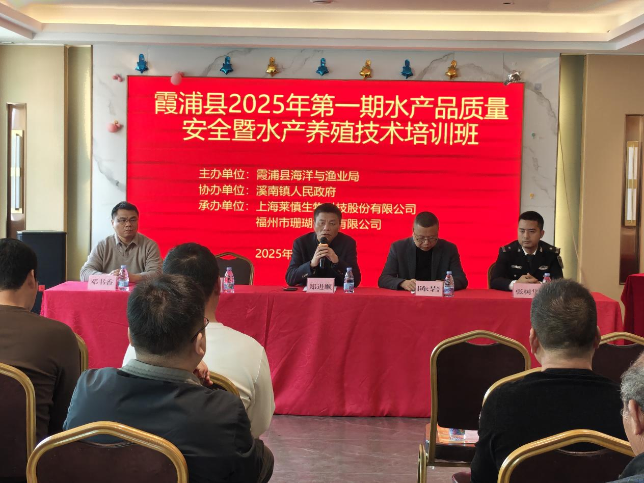 为提升水产养殖主体安全用药意识,推广水产绿色健康养殖技术,维护水生动物源食品安全,3月25日,由霞浦县海洋与渔业局主办、溪南镇人民政府协办、上海莱慎生物科技股份有限公司承办的“2025年第一期水产品质量安全暨水产养殖技术培训班”在溪南镇召开。霞浦县海洋与渔业局、溪南镇人民政府有关领导,浙江省海洋水产研究所高级工程师谢建军、上海莱慎生物科技股份有限公司产品技术总监邓书香等技术专家,以及霞浦县大黄鱼养殖生产主体、渔用兽药经营主体应邀参加会议。