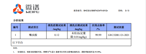 同鲜力的核心竞争力源于天然有机合成的大蒜E素(简称:ALE)。通过破坏微生物细胞膜抑制腐败,不同于化学保鲜剂的残留隐患,更加绿色安全,不仅"无化学残留",更能去除“农药残留”。