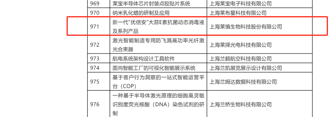 上海莱慎生物科技股份有限公司凭借旗下新一代“优倍安”大蒜E素抗菌动态消毒液及系列产品,最终于7000多家企业中脱颖而出,成功入选上海市2022年度科技型中小企业技术创新资金计划拟立项项目清单!