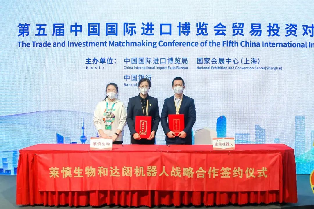 11月6号,第五届中国国际进口博览会(简称“进博会”)贸易投资对接会上,上海莱慎生物科技股份有限公司(简称“莱慎生物”)与达闼机器人股份有限公司(简称“达闼”)正式签署生态战略协议。双方将在公共卫生领域建立长期、建设性的生态战略合作伙伴关系,让莱慎生物的优倍安大蒜E素消毒产品与达闼的机器人载体彼此赋能,对公共区域消杀技术进行绿色、智能的升级。