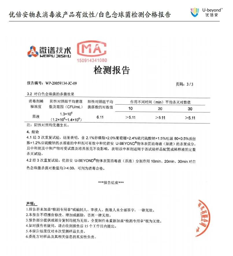 图:优倍安物表消毒液白色念珠菌检测报告