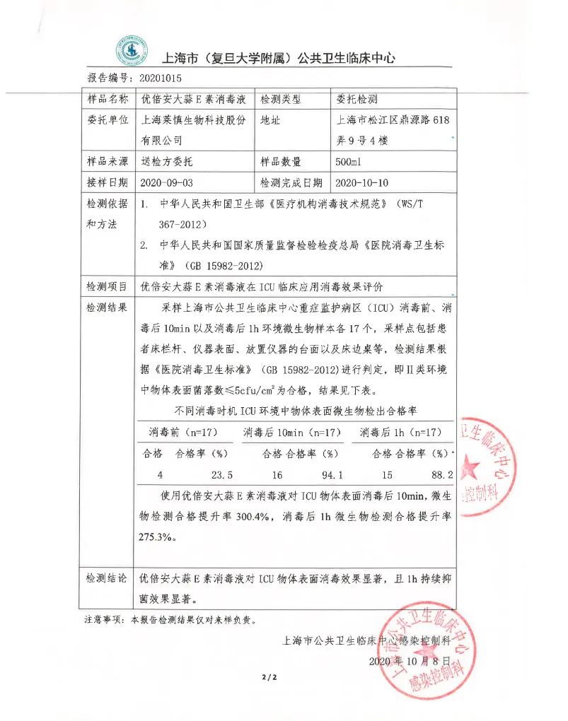 图:优倍安物表消毒液上海公卫中心ICU病房使用检测报告