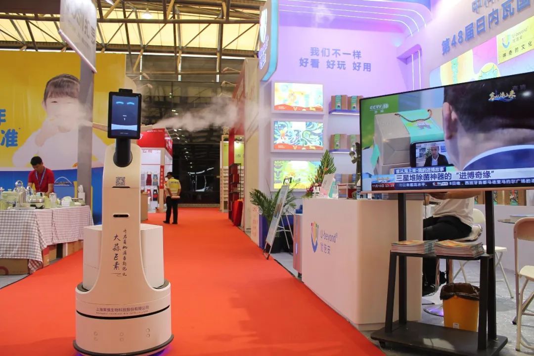 展位旁,曾经圆满完成去年进博会现场消杀任务的优倍安雾化消毒器和消毒机器人再次上岗进行空气消杀作业,忙忙碌碌地为每一位来到莱慎展台的客商提供全方位防护,避免人们受到空气中致病菌的侵染。